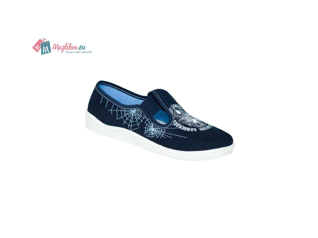 Chlapecké boty s jednou gumičkou z látky v tmavě modré barvě zdobené výšivkou. Boty ideální pro chlapce předškolního a školního věku. Stélka z bavlněné tkaniny a pružné pěny. Pěna obsahuje aktivní uhlí. Aktivní uhlí pohlcuje nepříjemné pachy a poskytuje noze pocit svěžesti.